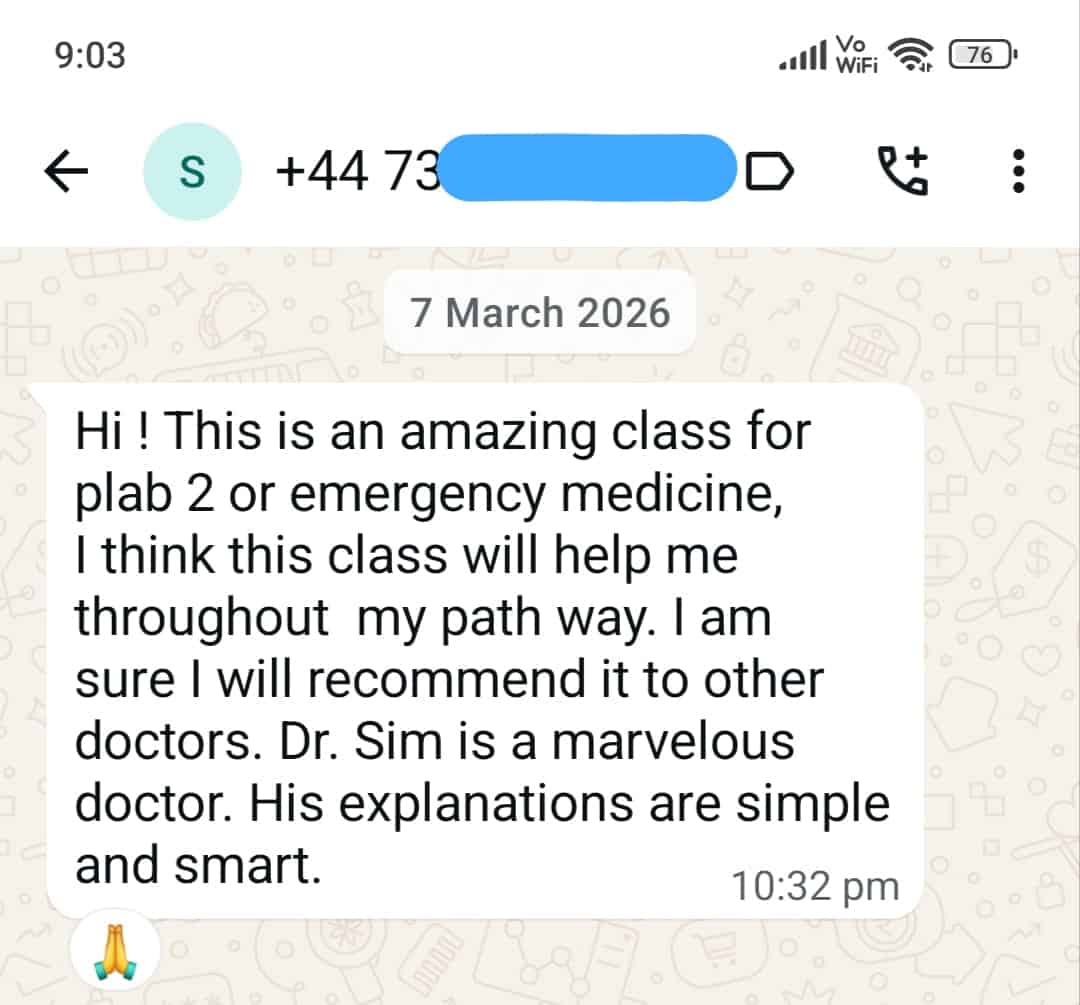 That is why we have designed a dedicated One-Day Intensive Live Online SimMan Course, held every alternate Saturday at 10:30 am UK Time via the Zoom platform and led by our SimMan expert, Dr. Sim. Our Online Live SimMan Course by Dr. Sim helps candidates get a high-quality and better close view of live MANIKIN teaching, strengthening their physical skill aspect of SimMan stations. Along with real-time physical teaching experience, Dr. Sim has integrated his own exquisite, high-yield, easy-to-learn, visually engaging teaching notes, focusing on every SimMan case of the PLAB 2 exam syllabus and teaching exam-oriented techniques to master and achieve SimMan station success, elevating your overall PLAB 2 exam score.